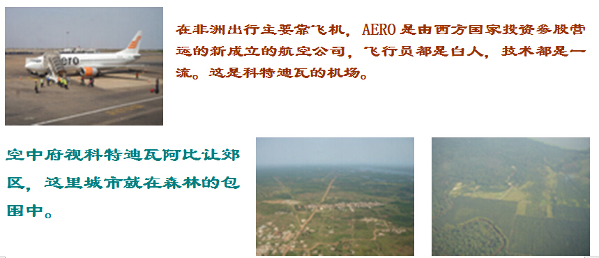 在非洲出行主要靠飛機(jī),AERO是由西方國(guó)家投資參股營(yíng)運(yùn)的新成立的航空公司,飛行員都是白人,技術(shù)都是一流。空中府視科特迪瓦阿比讓郊區(qū),這里城市就在森林的包圍中。
