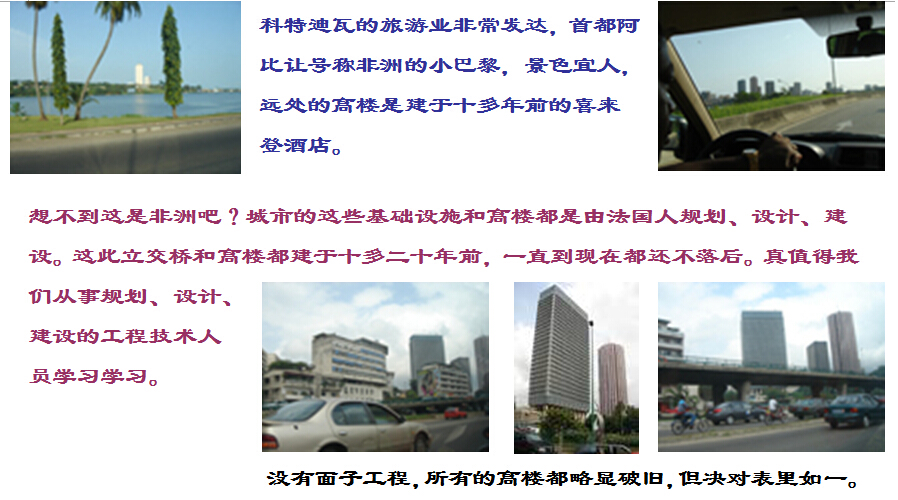 科特迪瓦的旅游業(yè)非常發(fā)達(dá),首都阿比讓號(hào)稱非洲的小巴黎,景色宜人,遠(yuǎn)處的高樓是建于十多年前的喜來(lái)登酒店。城市的基礎(chǔ)設(shè)施和高樓都是由法國(guó)人規(guī)劃、設(shè)計(jì)、建設(shè)。立交橋和高樓都建于十多二十年前,一直到現(xiàn)在都還不落后。真值得我們從事規(guī)劃、設(shè)計(jì)、建設(shè)的工程技術(shù)人員學(xué)習(xí)學(xué)習(xí)。