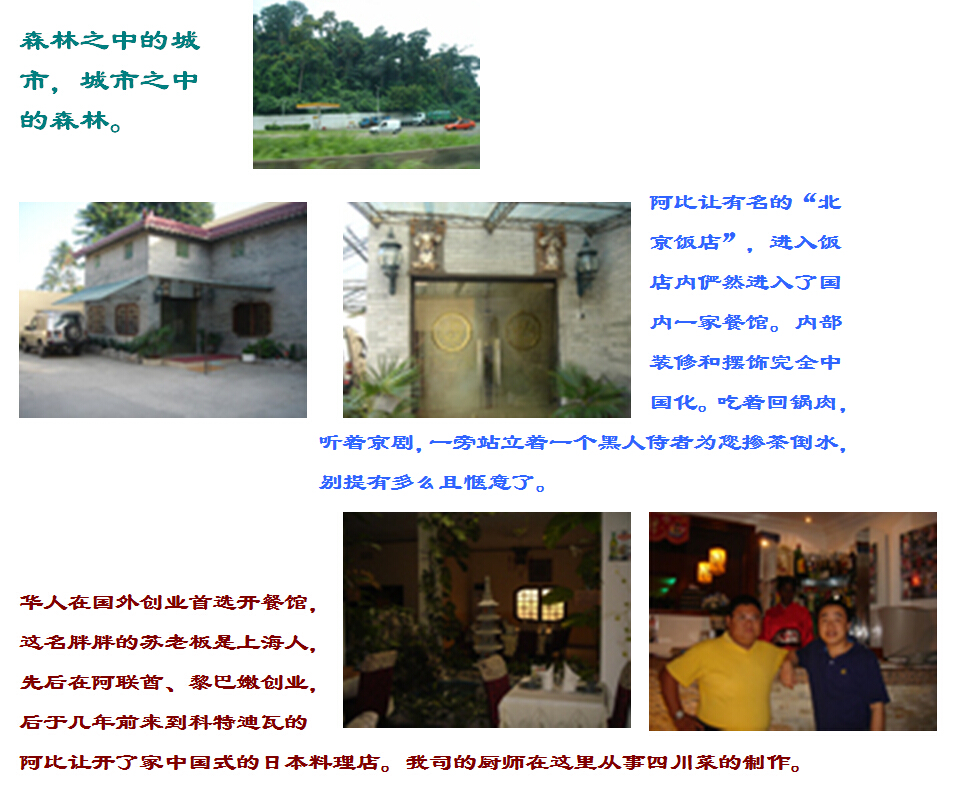 阿比讓有名的“北京飯店”,進(jìn)入飯店內(nèi)儼然進(jìn)入了國(guó)內(nèi)一家餐館。內(nèi)部裝修和擺飾完全中國(guó)化。吃著回鍋肉,聽(tīng)著京劇,一旁站立著一個(gè)黑人侍者為您摻茶倒水,別提有多么且愜意了。華人在國(guó)外創(chuàng)業(yè)首選開(kāi)餐館,這名胖胖的蘇老板是上海人,先后在阿聯(lián)酋、黎巴嫩創(chuàng)業(yè),后于幾年前來(lái)到科特迪瓦的阿比讓開(kāi)了家中國(guó)式的日本料理店。我司的廚師在這里從事四川菜的制作。