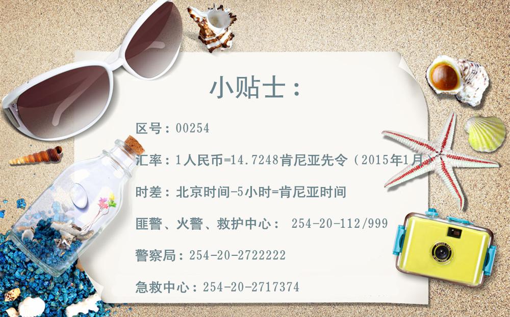 肯標準電壓為240伏,50赫茲,插座為英式三項插頭。當?shù)厥謾C間通話直撥手機號即可,撥打當?shù)刈鶛C020+固話號碼。用當?shù)厥謾C撥打國際長途:000+國家代碼+地區(qū)代碼+電話號碼。從中國撥打當?shù)厥謾C:00254+手機號(去掉手機號首位0)。