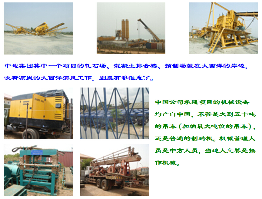 中地集團其中一個項目的軋石場、混凝土拌合樓、預制場就在大西洋的岸邊,吹著涼爽的大西洋海風工作,別提有多愜意了。中國公司承建項目的機械設備均產(chǎn)自中國,不管是大到五十噸的吊車(加納最大噸位的吊車),還是普通的制磚機。機械管理人員是中方人員,當?shù)厝酥饕遣僮鳈C械。