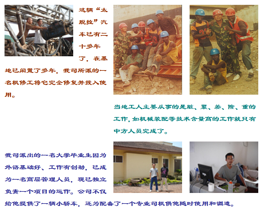 這輛“太脫拉”汽車已有二十多年了,在基地已閑置了多年,我司所派的一名機修工將它完全修復并投入使用。當?shù)毓と酥饕獜氖碌氖桥K、累、差、險、重的工作,如機械裝配等技術含量高的工作就只有中方人員完成了。我司派出的一名大學畢業(yè)生因為外語基礎好、工作有創(chuàng)勁,已成為一名高層管理人員,現(xiàn)已獨立負責一個項目的運作。公司不僅給他提供了一輛小轎車,還為配備了一個專業(yè)司機供他隨時使用和調(diào)遣。我司人員在國外考察期間與派出人員在中地集團加納項目經(jīng)理部基地合影。這些由我司派出的人員已成為中地集團加納項目經(jīng)理部的中高層管理人員。