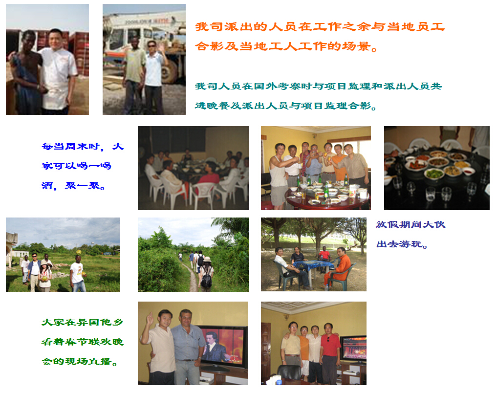 我司派出的人員在工作之余與當?shù)貑T工合影及當?shù)毓と斯ぷ鞯膱鼍?。我司人員在國外考察時與項目監(jiān)理和派出人員共進晚餐及派出人員與項目監(jiān)理合影。每當周末時,大家可以喝一喝酒,聚一聚。放假期間大伙出去游玩。
