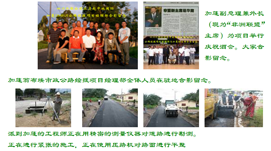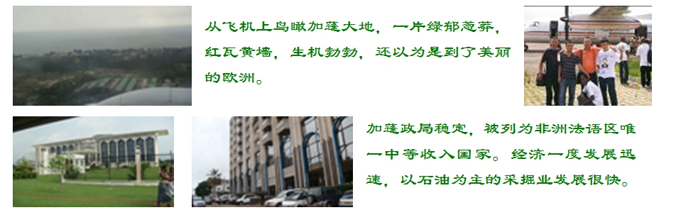 從飛機上鳥瞰加蓬大地,一片綠郁蔥莽,紅瓦黃墻,生機勃勃,還以為是到了美麗的歐洲。加蓬政局穩(wěn)定,被列為非洲法語區(qū)唯一中等收入國家。經(jīng)濟一度發(fā)展迅速,以石油為主的采掘業(yè)發(fā)展很快。加蓬年平均氣溫26℃,擁有豐富的森林資源,森林面積占全國土地面積的85%,被譽為非洲的“綠金之國”。加蓬的氣候很適宜植物的生長,美麗的出產(chǎn)的蔬菜瓜果品種繁多,真稱得上花朵,絢麗而多姿。加蓬副總理兼外長(現(xiàn)為“非洲聯(lián)盟”主席)為項目舉行慶祝酒會。大家合影留念。加蓬翁布埃市政公路經(jīng)援項目經(jīng)理部全體人員在駐地合影留念。派到加蓬的工程師正在用精密的測量儀器對道路進行勘測。正在進行緊張的施工,正在使用壓路機對路面進行平整站在自己修建的馬路上,別有一翻滋味在海邊一處施工工地現(xiàn)場。